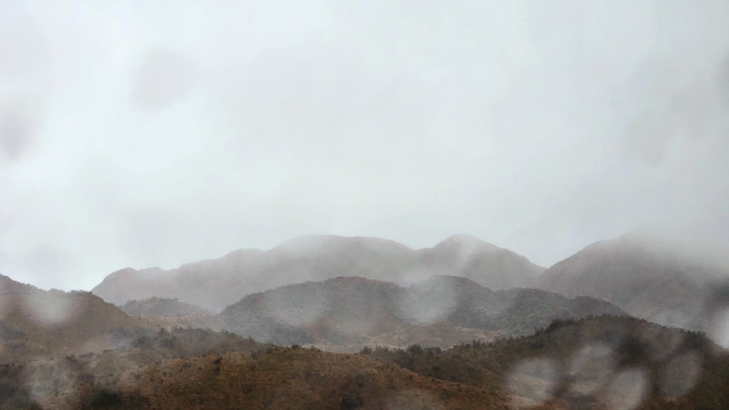 Andes mountains in the rain, view from the car window