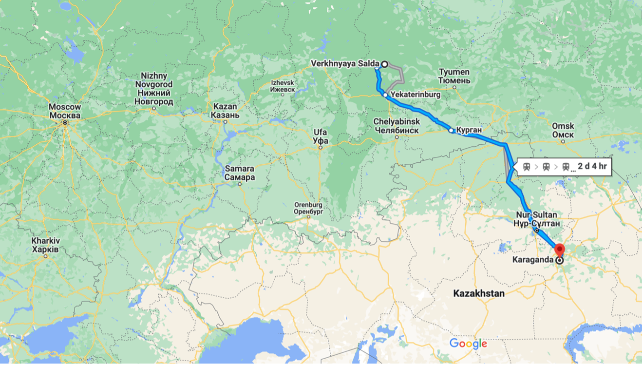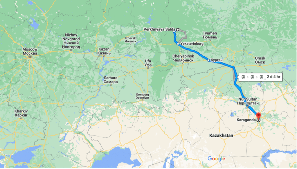 Vorkuta is almost directly north of Karaganda, a little over 2000 kilometers as the crow flies. The etap from Karaganda to Vorkuta usually started at the Karaganda train station, but for some unknown reason no trains were available. When the guards finally allowed the prisoners to get out of the truck to relieve themselves, Abram counted somewhere between 15 and 20 trucks sitting near a stretch of train tracks. The prisoners were given water and bread; every hour or so the guards would take turns and sneak out of the truck for smoke breaks. Abram did not have a watch, but at least 24 hours had passed from their arrival to the train station. He could hear more trucks arrive, guards arguing outside, someone shouting orders. Every few hours the prisoners would be allowed to relieve themselves; once more, in the morning of the next day, they were given more water and bread.