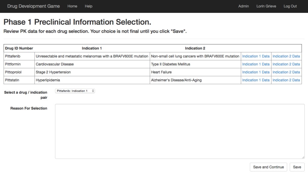 The game begins with the class being divided into groups of 6, with each group taking on the role of a small pharmaceutical start-up company. Each group is tasked with assessing preclinical information related to four fictional new drugs; identifying which disease state they wish to pursue in order to make the most money for their company; designing the phase one, phase two, and phase three clinical trials; experiencing those trials through mannequin-based simulations; providing a press release following each phase trial; finally presenting results to the FDA for marketing approval. This allows pharmacy students the chance to experience the trials and tribulations of bringing a new drug to market, understanding the process more intrinsically than if it were presented through didactic lectures.