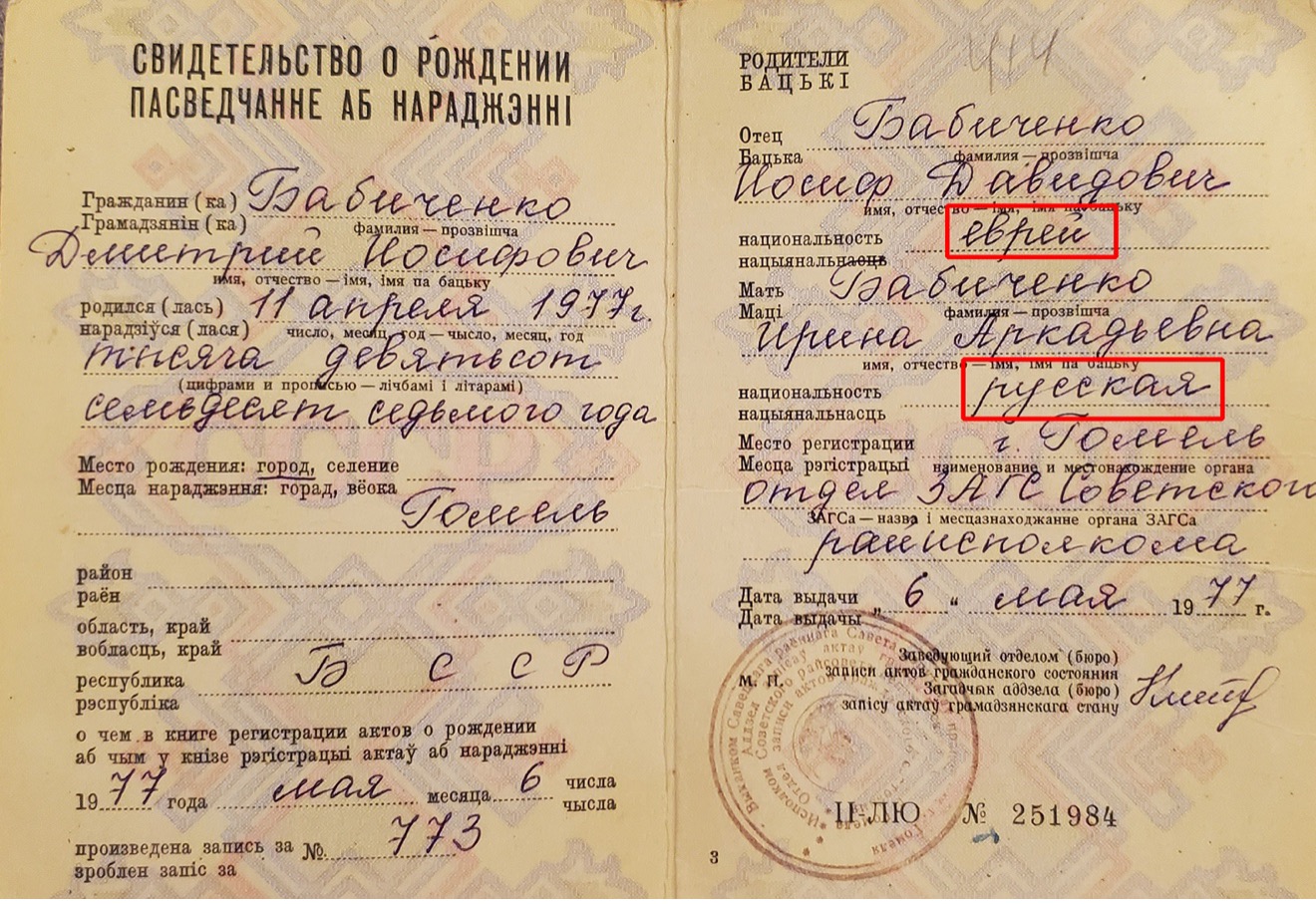 I was happily ignorant of my nationality until one of the kids in my grade decided to flip through the class journal. “Hey everybody, did you know that Dima is a Jew?” – he announced to the whole class. Everyone turned to look at me. “Are you really a Zhyd?” – someone asked me. “I don’t think so!” – I answered. – “My mother is Russian.”